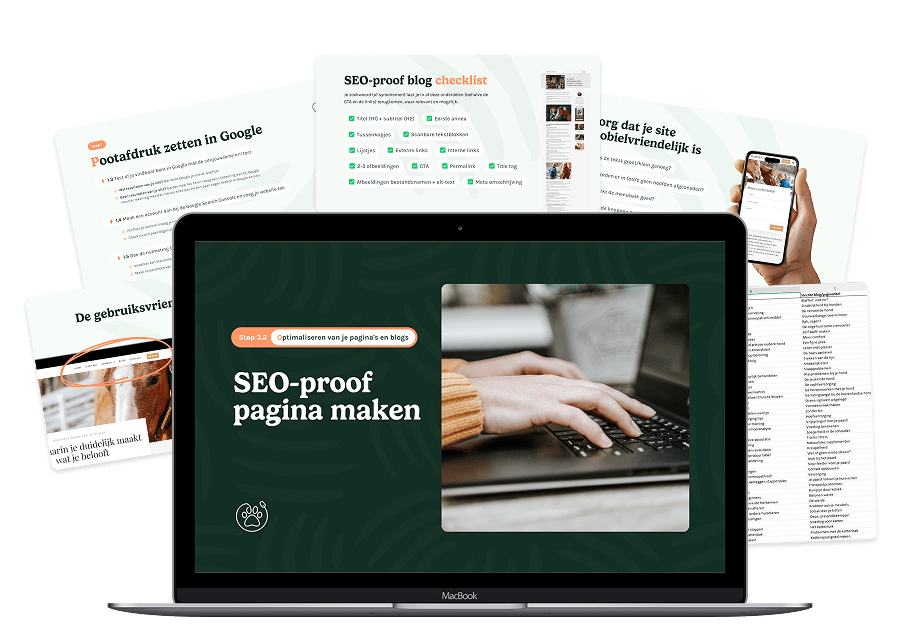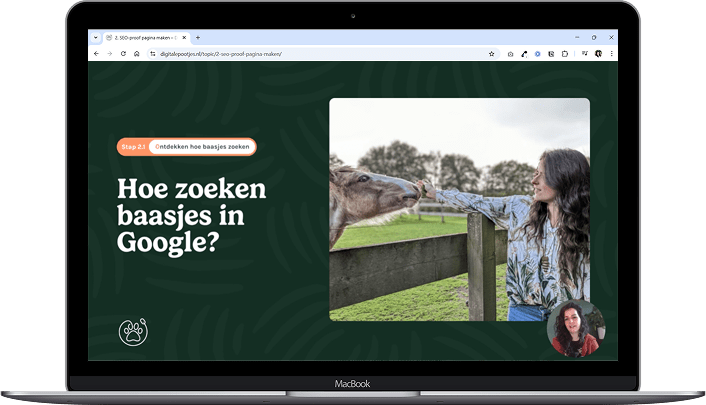 Werk je lokaal, zoals een hondenschool, kattentrimmer of paardenfysio? Dan is lokale SEO dé manier om beter gevonden te worden door baasjes in jouw omgeving. In deze bonus leer je hoe je meer lokale zichtbaarheid krijgt.
